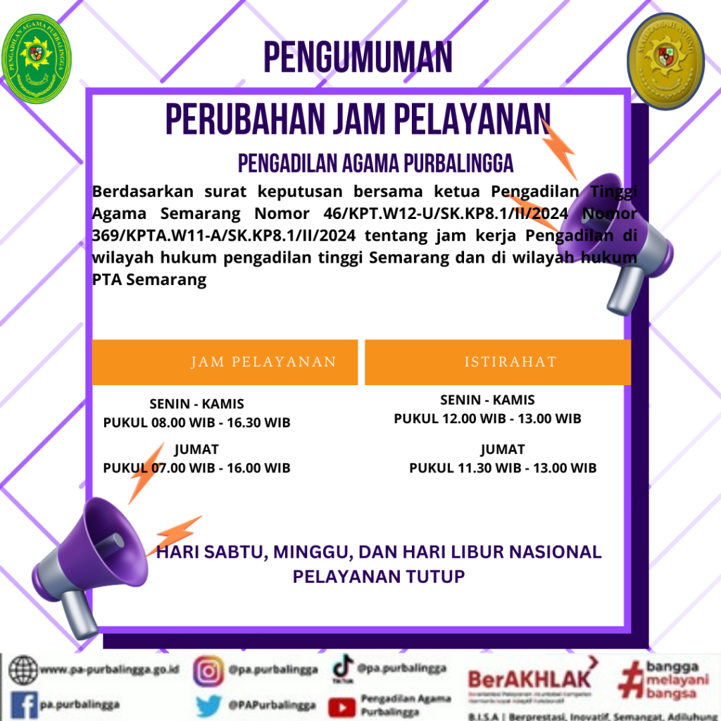 Keputusan Bersama Ketua Pengadilan Tinggi Semarang dan Ketua Pengadilan Tinggi Agama Semarang Nomor : 46/KPT.W12-U/SK.KP8.1/II/2024 dan Nomor : 369/KPTA.W11-A/SK.KP8.1/II/2024 Tanggal 12 Februari 2024 Tentang Jam Kerja Pengadilan di Wilayah Hukum Pengadilan Tinggi Jawa Tengah dan di Wilayah Hukum Pengadilan Tinggi Agama Semarang