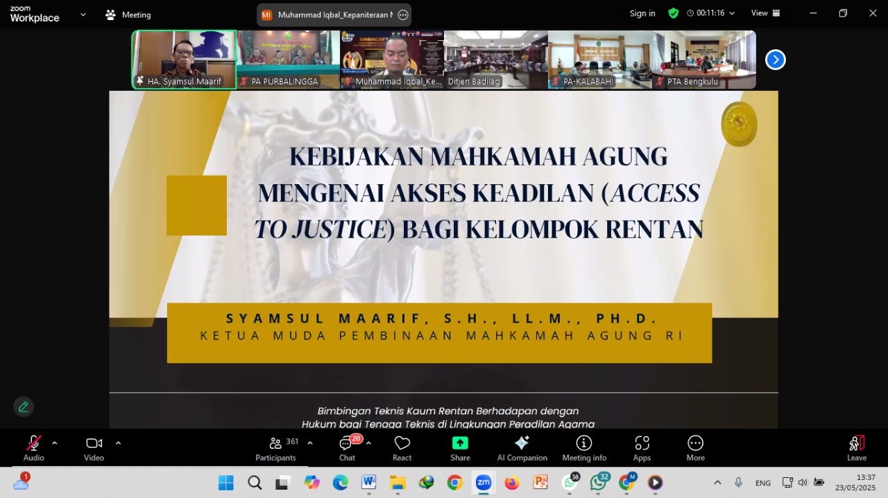 Pada Jum’at 23/05 pukul 13.30 WIB Ketua Pengadilan Agama Purbalingga mengikuti bimbingan teknis kaum rentan berhadapan dengan hukum bagi tenaga teknis di lingkungan Peradilan Agama secara daring dengan video telekonferensi melalui zoom meeting di Ruang Media Center berdasarkan surat edaran nomor : 1138/DJA/DL1.10/V/2025 tanggal 20 Mei 2025. Selain diikuti oleh Ketua PA Purbalingga Bapak Alwin, S.Ag., M.H., juga diikuti oleh Panitera Muda Hukum PA Purbalingga Achmad Rathomi, S.H., Panitera Pengganti Ghofur Dwi, S.H., dan Yusuf Efendi, S.H.