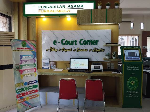 Pojok e-Court yang berada di Pengadilan Agama Purbalingga merupakan salah satu fasilitas yang disediakan untuk membantu masyarakat dalam melakukan pendaftaran perkara secara elektronik (e-Filing) dan proses peradilan lainnya secara online. Pojok e-Court ini merupakan upaya untuk meningkatkan pelayanan peradilan yang lebih sederhana, cepat, dan biaya ringan, sesuai dengan program prioritas Mahkamah Agung.