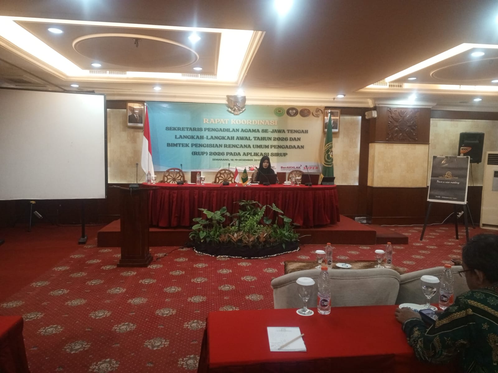 Pada Kamis 18/12/25 Pukul 09.00 WIB bertempat di PTA Semarang, telah diselenggarakan acara rapat koordinasi Sekretaris PA Se – Jawa Tengah dan Bimtek Pengisian Rencana Umum Pengadaan Tahun 2026. Acara ini dihadiri oleh Sekretaris Pengadilan Agama (PA) Se-Jawa Tengah termasuk Sekretaris PA Purbalingga, Rizal Zaenal Abidin, S.H., dan Kasubag Umum Keuangan Harmoni Ikhda Febriana, S.E.