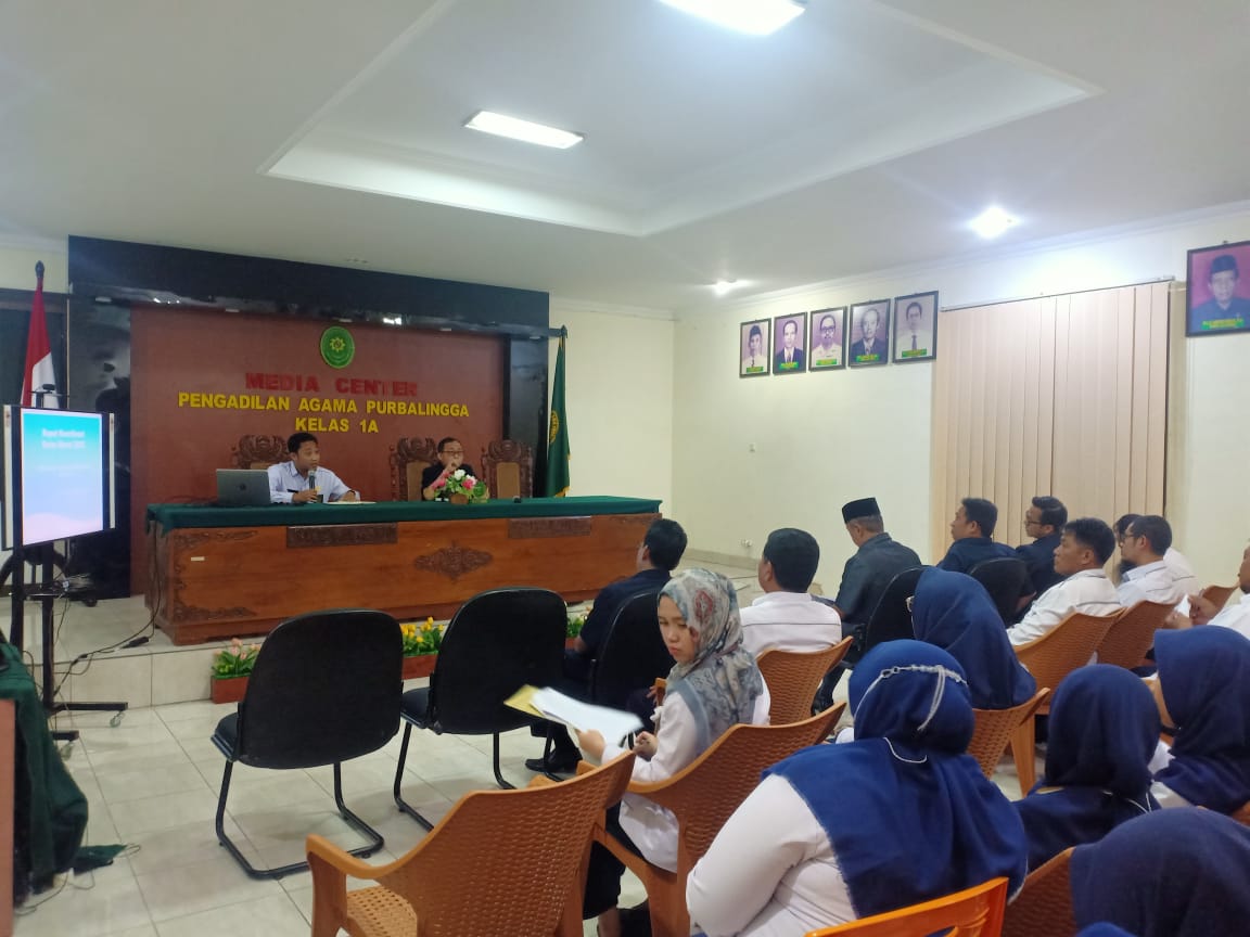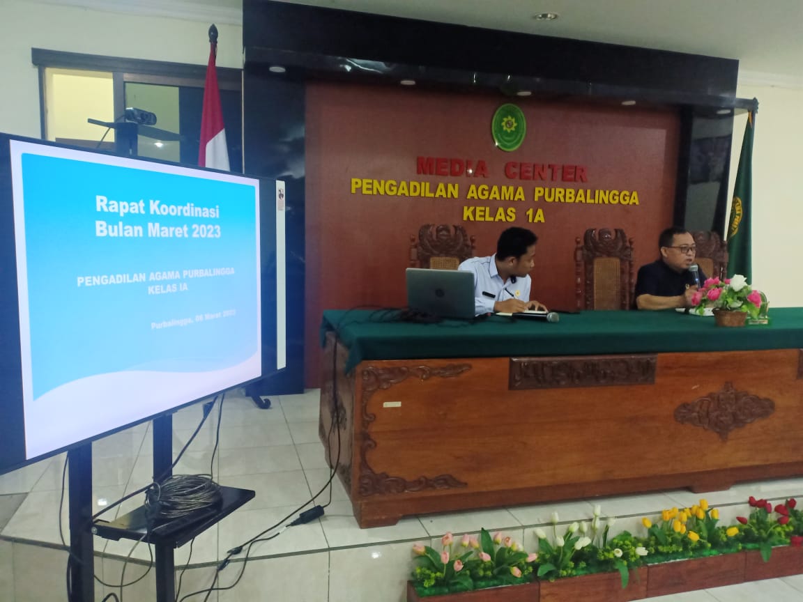 Pada hari Senin (06/03) pukul 14.00 WIB dilaksanakan rapat koordinasi internal diruang Media Center PA Purbalingga. Kegiatan ini dihadiri oleh seluruh aparatur Pengadilan Agama Purbalingga berdasarkan surat undangan nomor A23/666/OT.1.1/III/2023 tanggal 03 Maret 2023. Agenda tersebut dimoderatori oleh Sekretaris Rizal Zaenal Abidin, S.H. dan dipimpin oleh Wakil Ketua Dr. Rifai, S.Ag., S.H., M.H. Tujuan diadakan rapat ini yaitu untuk membentuk satu tujuan dan misi agar dapat berjalan beriringan serta sebagai wadah penghubung aspirasi aparatur Pengadilan Agama Purbalingga. Rapat koordinasi membahas program kerja 2023, serta pelaksanaan zona integritas di Pengadilan Agama Purbalingga. Semoga dengan adanya rapat koordinasi dapat meningkatkan kinerja kesekretariatan maupun kepaniteraan Pengadilan Agama Purbalingga. (Yesi/Team Media).