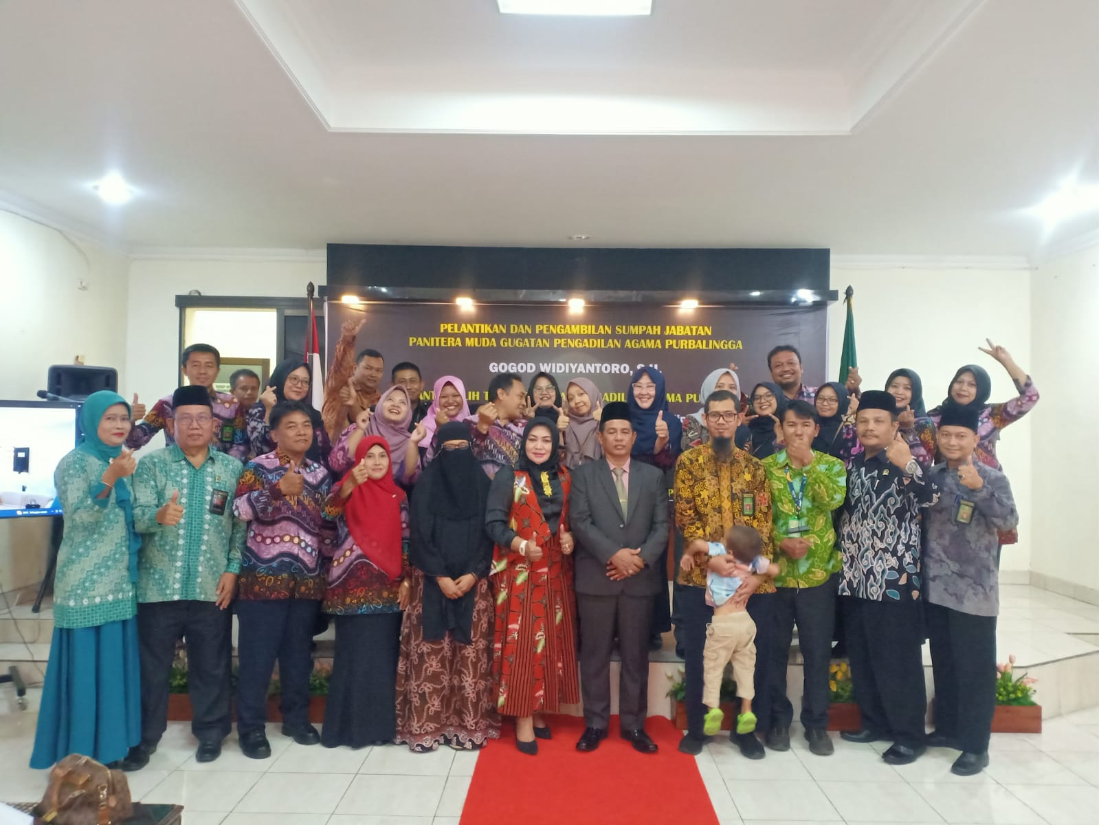 Bertempat di ruang Media Center, Kamis (19/10) pukul 09.00 WIB telah diselenggarakan acara pelantikan dan pengambilan sumpah jabatan panitera muda gugatan pengadilan agama Purbalingga Gogod Widiyantoro, S.H., serta pengantar alih tugas pegawai pengadilan agama Purbalingga Sudin, S.Ag., M.H., (sebagai Panitera Pengganti Pengadilan Tinggi Agama Semarang), Awwab Nafies, S.H. (sebagai Panitera Muda Permohonan Pengadilan Agama Banjarnegara), dan Drajat Prakosa, S.H. (sebagai Kasubbag Perencanaan, evaluasi dan laporan Pengadilan Agama Banyumas) guna menindaklanjuti surat edaran Direktorat Jenderal Badan Peradilan Agama nomor : 3014/DJA/KP4.1.3/X/2023 tentang hasil rapat tim badan pertimbangan jabatan dan kepangkatan tenaga teknis kepaniteraan di lingkungan peradilan agama. Kegiatan ini dihadiri oleh Ketua Pengadilan Agama Temanggung Muhammad Imron, S.Ag., M.H., Dharmayuktikarini Purbalingga serta seluruh aparatur pengadilan agama Purbalingga. Adapun tujuan dilakukan mutasi adalah untuk menciptakan keseimbangan antar tenaga kerja dengan komposisi pekerjaan atau jabatan, untuk memperluas atau menambah pengetahuan pegawai, untuk menghilangkan rasa bosan/jenuh tehadap pekerjaan, untuk memberikan dorongan agar pegawai mau berupaya meningkatkan karir yang lebih tinggi. Diharapkan dengan adanya mutasi ini akan membawa kemajuan bagi Pengadilan Agama Purbalingga