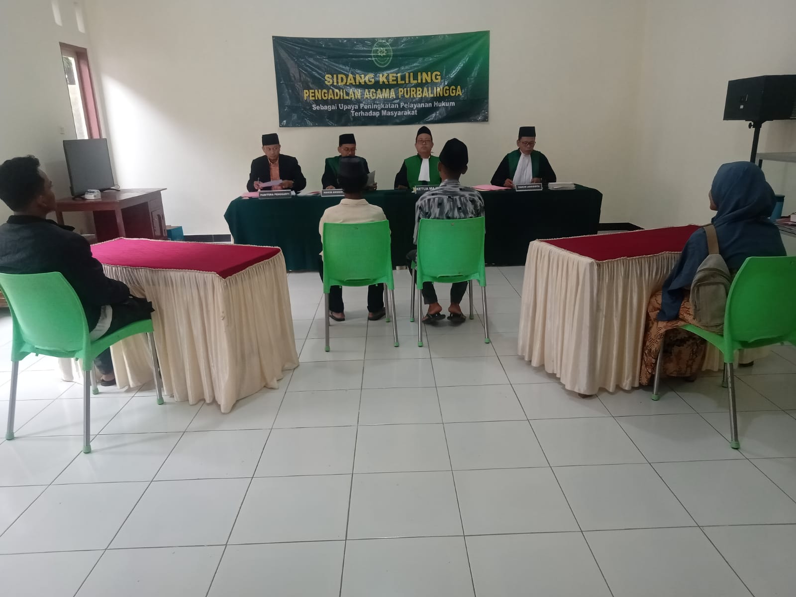 Sidang di luar gedung ini dipimpin oleh Wakil Ketua Pengadilan Agama Purbalingga, Dr. Rifai, S.Ag., S.H., M.H., didampingi oleh Dua hakim, yaitu Drs. Baridun dan Awalludin Nur Imawan, S.Ag. Selain itu, juga hadir Panitera Pengganti, Yusuf effendi, S.H. serta dua pegawai PPNPN, yaitu Andang Aji, A.Md. dan Sidik Arif.