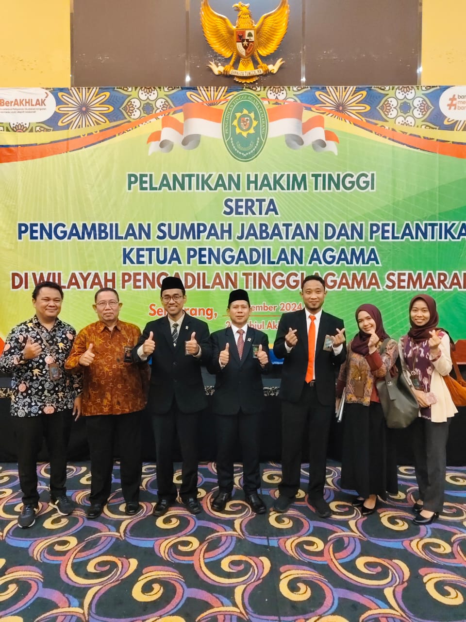 Pengadilan Tinggi Agama Semarang pada Jum'at (01/11) pukul 08.00 WIB bertempat di Hotel Grasia Semarang menggelar acara pengambilan sumpah jabatan dan pelantikan Hakim Tinggi Serta Pengambilan Sumpah Jabatan dan Pelantikan Ketua Pengadilan Agama Di Wilayah PTA Semarang. Acara ini diselenggarakan berdasarkan surat Direktur Jenderal Badan Peradilan Agama Mahkamah Agung RI tanggal 10 Oktober 2024 tentang Hasil Rapat Tim Promosi Mutasi Hakim Mahkamah Agung R.I. Ketua PTA Semarang melantik Hakim Tinggi dan 8 Ketua Pengadilan Agama di wilayah PTA Semarang.