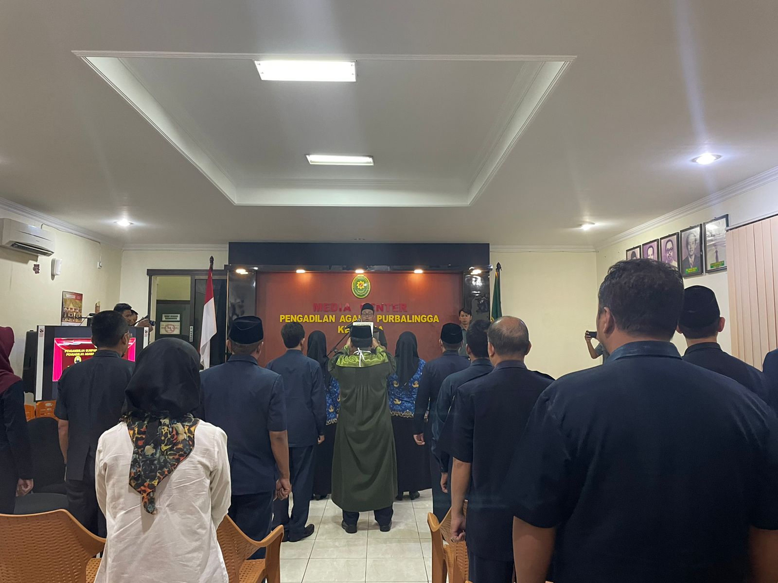 Acara inti yaitu pengambilan sumpah Pegawai Negeri Sipil Pengadilan Agama Purbalingga kelas IA golongan II yang dipimpin oleh Wakil Ketua Dr. Rifai, S.Ag., S.H., M.H. sebagai saksi Panitera Muda Hukum Achmad Rathomi, S.H. dan Panitera Muda Permohonan Abdul Hafid, S.Kom., S.H. serta Rohaniwan Panitera Muda Gugatan Sudin, S.Ag., M.H.