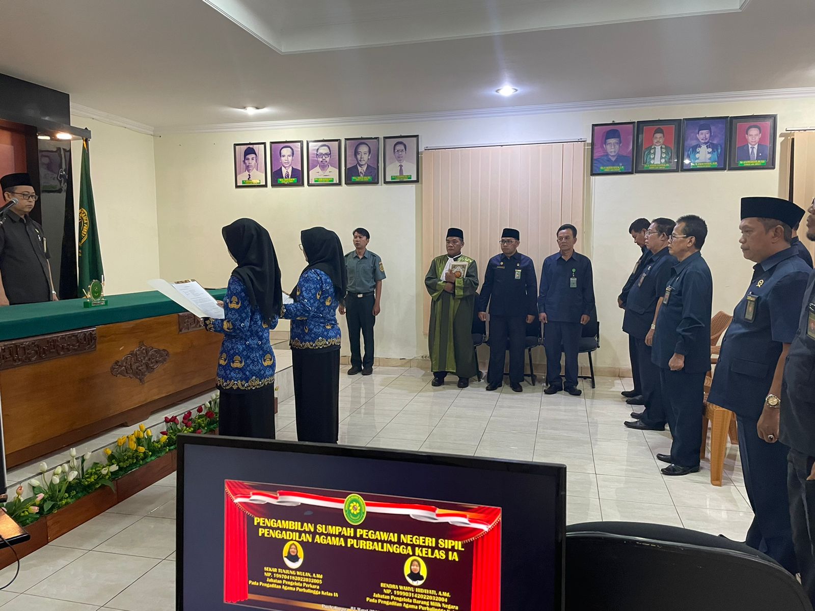Bertempat di Media Center, Rabu (01/03) pukul 14.00 WIB telah dilaksanakan pengambilan sumpah Pegawai Negeri Sipil Pengadilan Agama Purbalingga kelas IA golongan II. Adapun Pegawai Negeri Sipil yang dilantik yaitu Rendra Wahyu Hidayati, A.Md. dan Sekar Tunjung Wulan, A.Md. Dihadiri oleh Wakil, para Hakim, pejabat struktural, fungsional, para staf, serta PPNPN PA Purbalingga acara pengambilan sumpah berjalan dengan lancar.