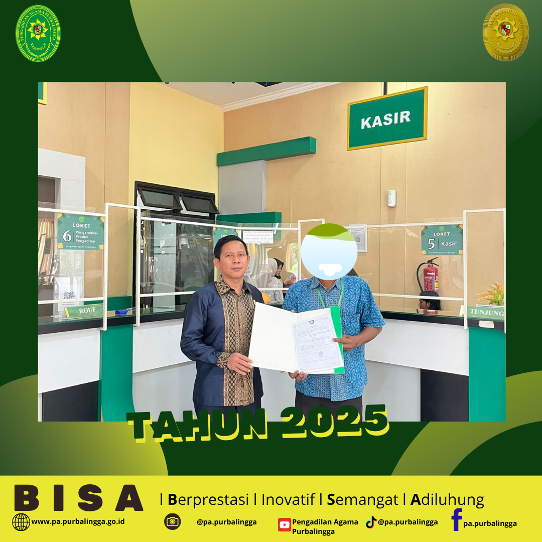 Penyerahan perdana E-AC PA Purbalingga dengan Nomor Perkara 741/Pdt.G/2025/PA.Pbg. Ketua Pengadilan Agama Purbalingga Bapak Alwin, S.Ag., M.H. mengatakan bahwa Pengadilan Agama Purbalingga telah memberlakukan penerbitan Salinan Putusan dan Akta Cerai secara elektronik. Hal ini sesuai dengan Surat Edaran Mahkamah Agung Nomor 1 Tahun 2024 tentang Penerbitan Salinan Putusan dan Akta Cerai di Lingkungan Peradilan Agama secara Elektronik.
